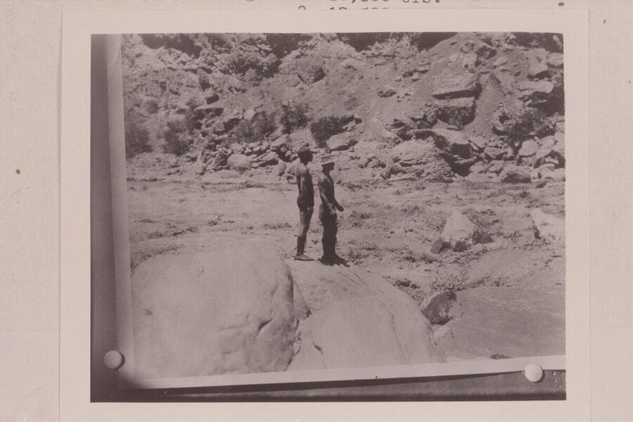 Portaging the "Coronado" at Vulcan Rapid. Adger wears the striped shirt. Bartl is at the bow