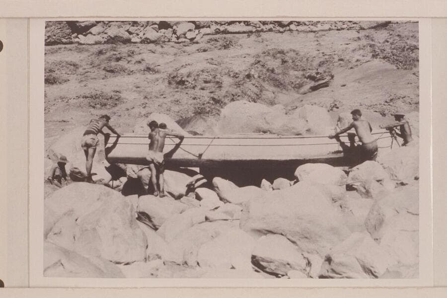 Eddy crew portaging one of the heavy boats at Vulcan Rapid, the "Coronado."