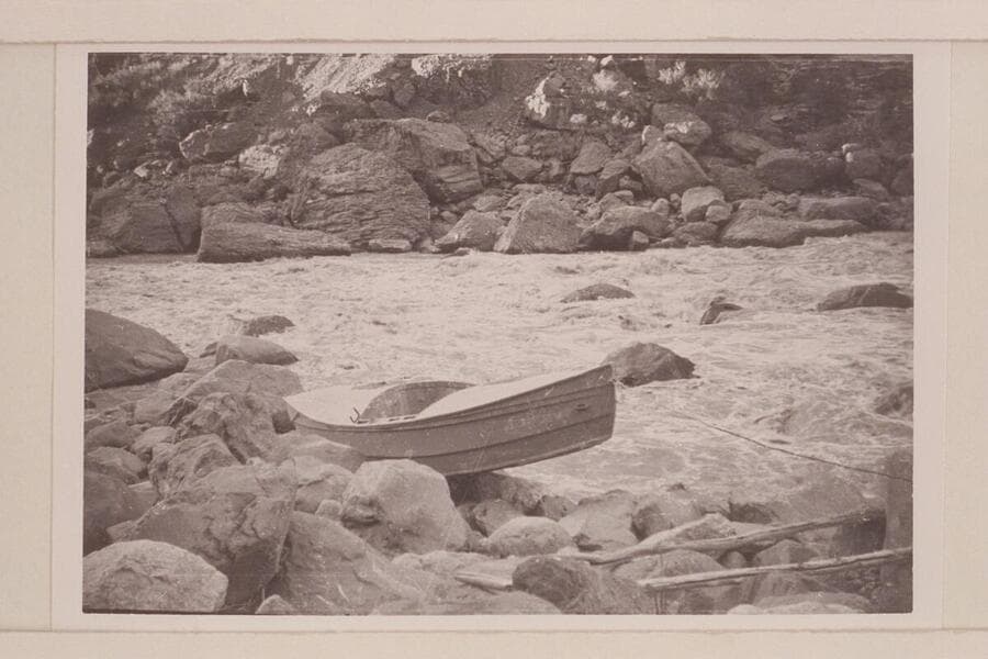 Buzz Holmstrom's boat being portaged at Vulcan Rapid