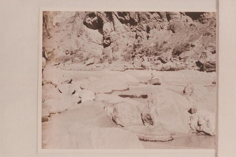 Lining the Nevills skiffs at Lava Falls. Nevills is in the boat. Garth Marston is handling the stern line and Randall Henderson watches