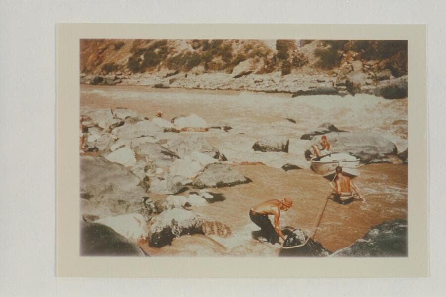 Lining a Nevills sadiron at Vulcan Rapid. Garth Marston is in the river. Nevills sits on the deck