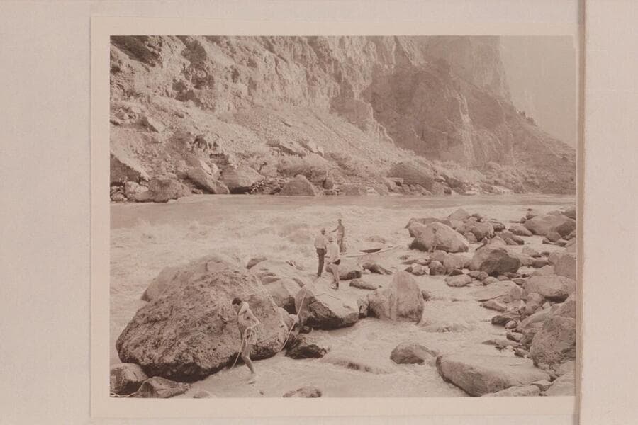 Lining of the Nevills skiffs at Lava Falls. Garth Marston is taking the stern line down at the left. John Riffey and Randall Henderson stand on the rocks taking instructions from Nevills. Kent Frost stands among the rocks at the right