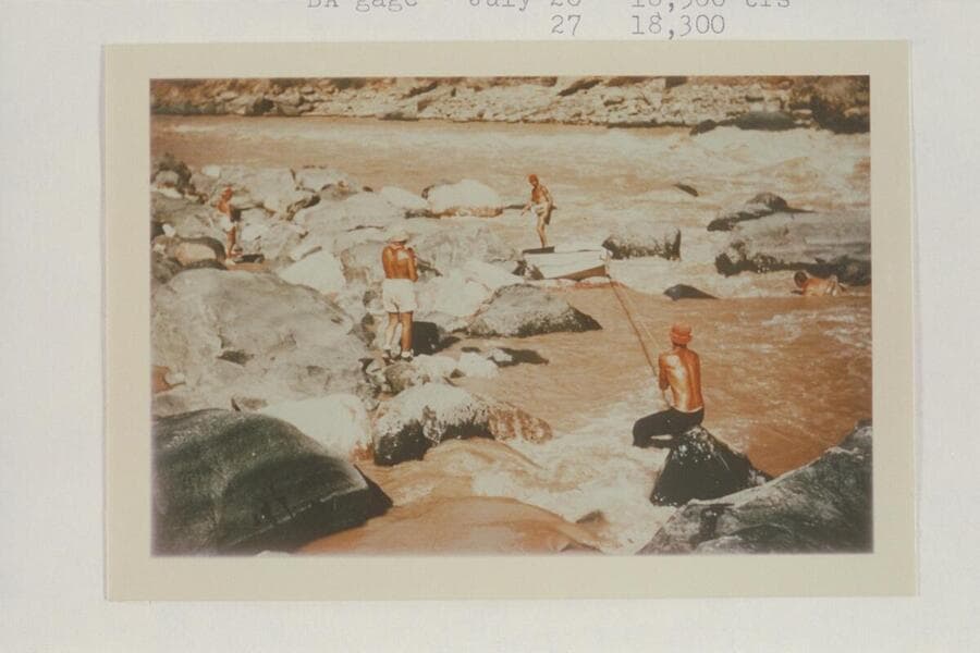 Nevills crew lining Vulcan Rapid. Nevills stands on the skiff; Milotte tries for a picture from left; Frost strains on the painter; Joe Desloge struggles in the water at right