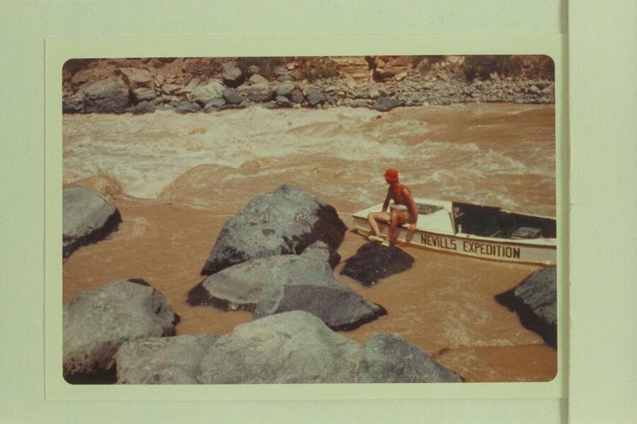 Nevills perched on the stern of a sadiron being lined at Vulcan Rapid
