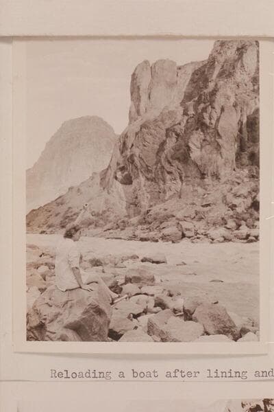 Reloading a boat after lining and portage at Lava Falls. Left to right: Joe Desloge; Garth Marston, Otis Marston