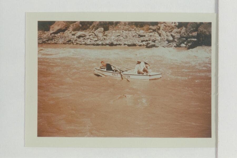 Dropping down the eddy below Vulcan Rapid after lining the Nevills sadirons. Nevills scrambles to close the hatch. Joe Desloge and Margaret Marston sit on the stern
