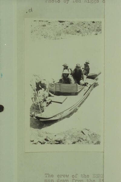 The "Esmeralda" lands at the right bank above Lava Falls. Left to right: Marston' Hudson at the wheel; Taylor; Edward Hudson; Bestor Robinson