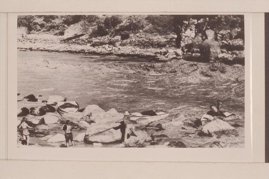Portage of Caltech boat at Vulcan Rapid. Frank Dodge is on the port side of the boat. Owen Clark, Merrill Spencer, and Ian Campbell are inshore