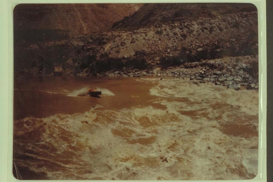 Motorboat driving into head of Lava Falls. Marston, Desloge, and Taylor in the boat