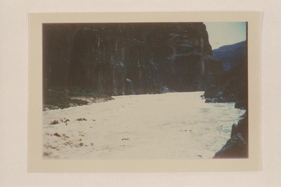 Inboard motorboat completely hidden behind barrier wave at head of Vulcan Rapid