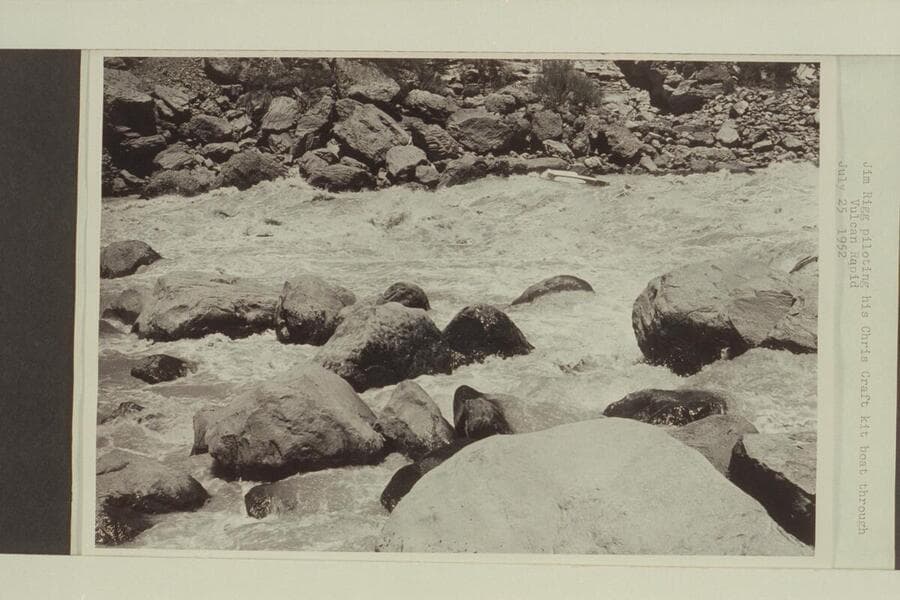 One of the Wright-Rigg Chris-Craft Kit Boats in Soap Creek Rapid. Copy of print in album of Rosalind Johnson