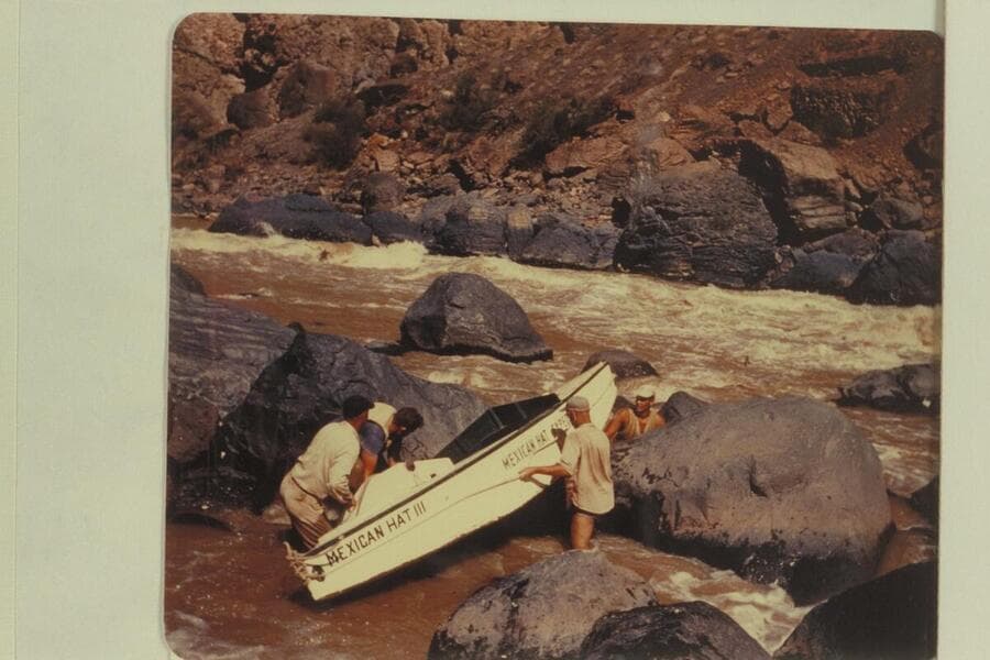 Lining of the "Mexican Hat III"--or is it a portage? Frank Wright; John Harper; Bill Thompson; Willard Wright. No life preserver protection for the leader and others. Georgie White ran her party through the rapid at this same time