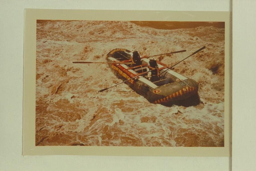No. 1 pontoon of the Don Hatch party in Soap Creek Rapid. Mary Dorsey riding as passenger. Bruce and Clarke Lium as boatmen