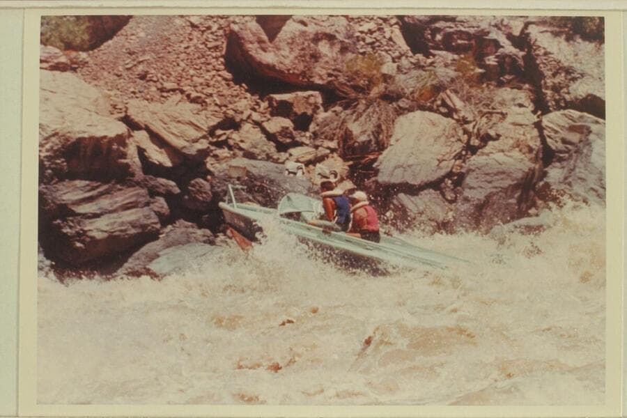 Buzz Belknap piloting the "Bootoo" through Vulcan Rapid. Dock Marston is the passenger
