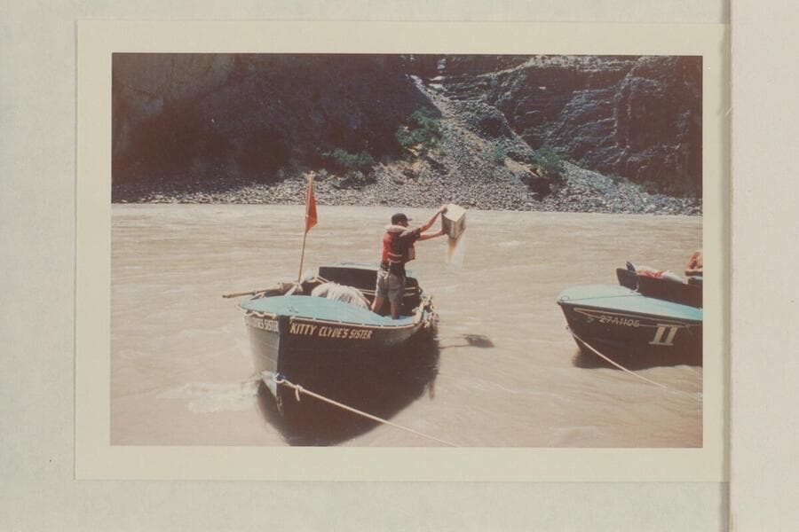 Vee Bodrero bails the "Kitty" after her run of Vulcan Rapids; approximate gauge 23,000 cfs