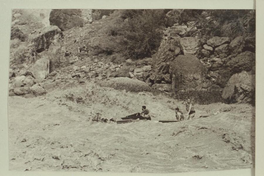 The Deck-Boat starting into Vulcan Rapid. Jim-Bob Rowlands is at the wheel. Dock Marston is piloting. Jim Jordan and Shell Wimpfen sit aft