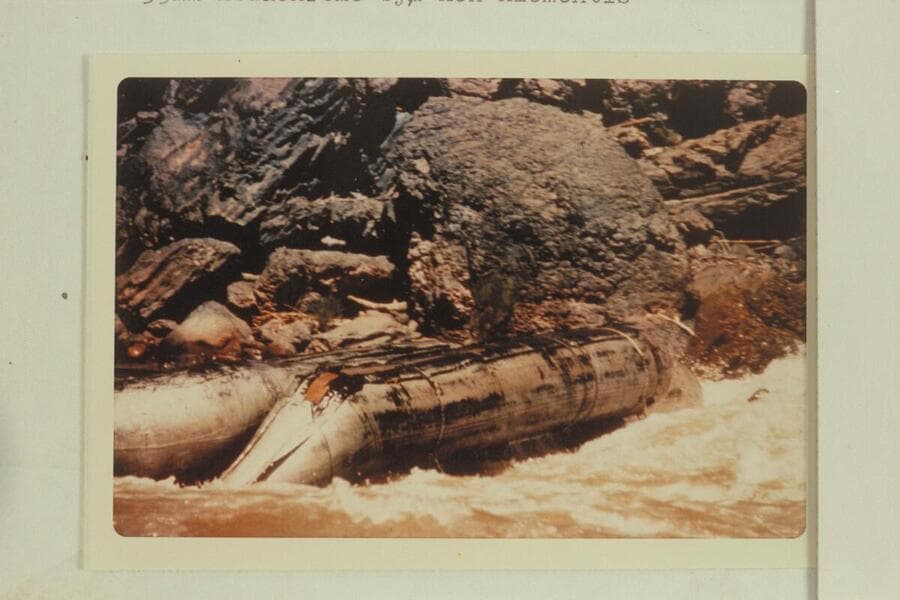 Baloney floating from big hole in Vulcan Rapid after capsizing
