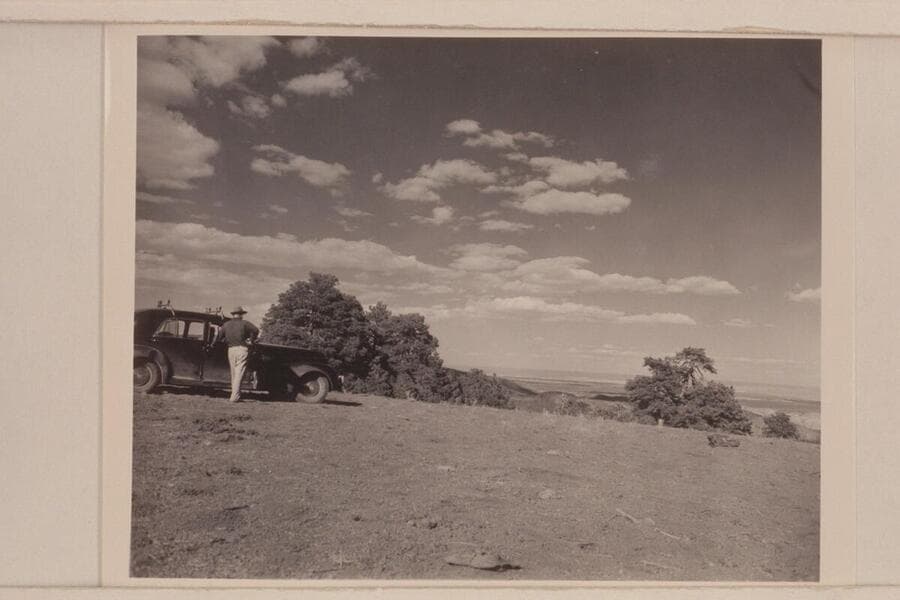 Chet Bundy stands by our car near the top of Mt. Logan. The Grand Canyon appears in the distance