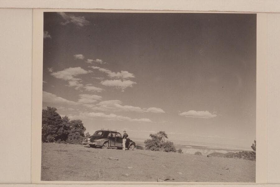 Chet Bundy stands by our car near the top of Mt. Logan. The Grand Canyon appears in the distance