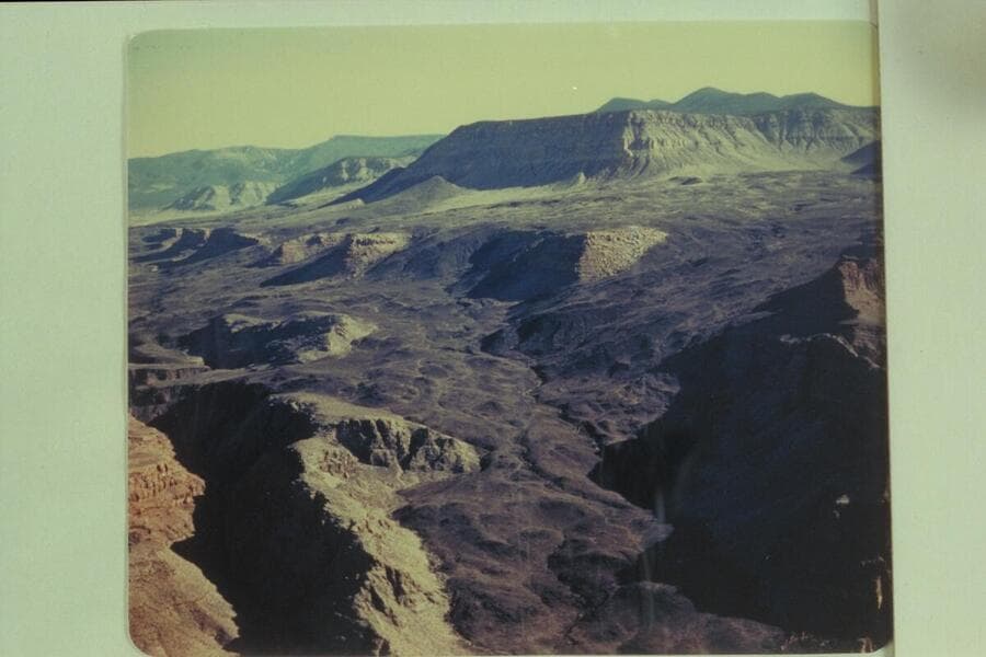 Across Toroweap Valley. Mt. Emma upper left; Mt. Logan upper center; Mt. Trumbull upper right; Vulcans Throne lower left