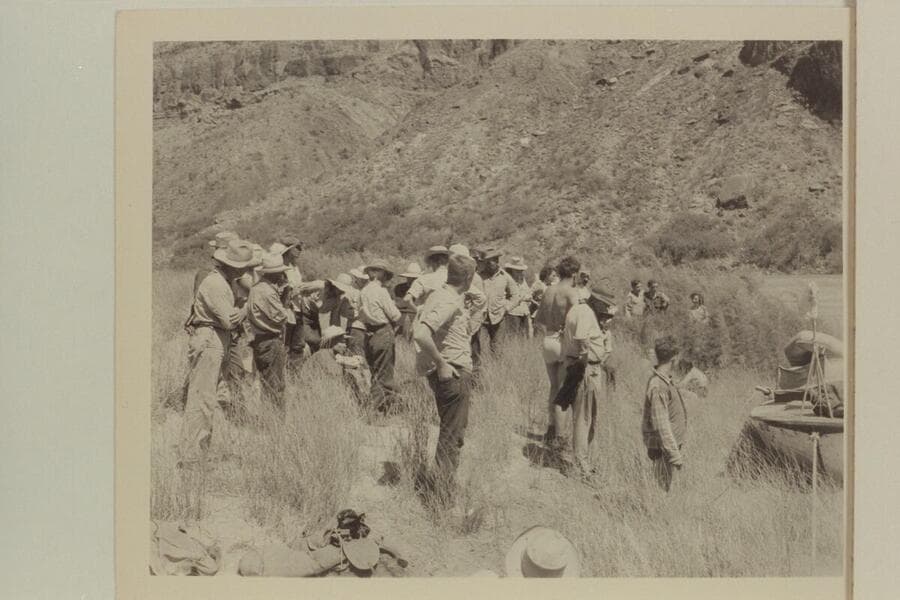 The Bundy family at Whitmore Trail welcoming the "Esmeralda II", the first motorboat to transit Grand Canyon