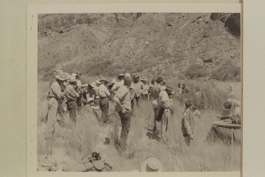 The Bundy family at Whitmore Trail welcoming the "Esmeralda II", the first motorboat to transit Grand Canyon