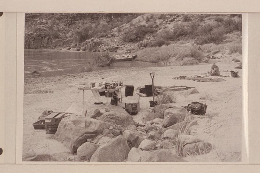 Camp gear and sleeping quarters at Mile 192; boat mooring. Masland is breaking out of the sack