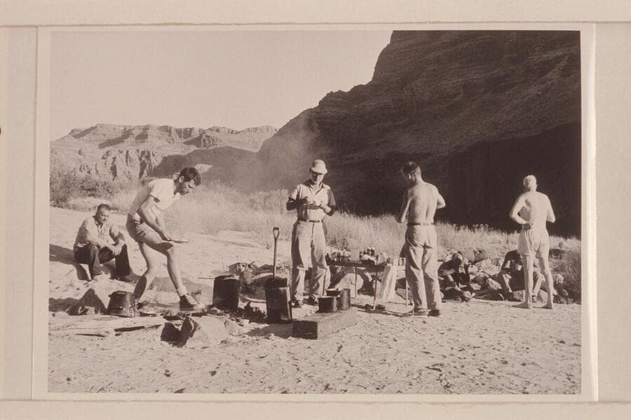Breakfast at camp at Mile 192. Chet Bundy, Bill Beer, Ballard Atherton, Hugh Cutler and Joe Desloge. Hidden by the standing figures are Josh Eisaman and Chuck Richey