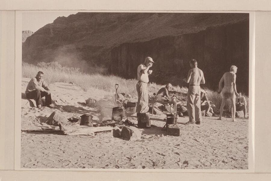 Breakfast at camp at Mile 192. Chet Bundy, Ballard Atherton, Josh Eisaman, Hugh Cutler almost hides Rod Sanderson, and Joe Desloge hides Chuck Richey