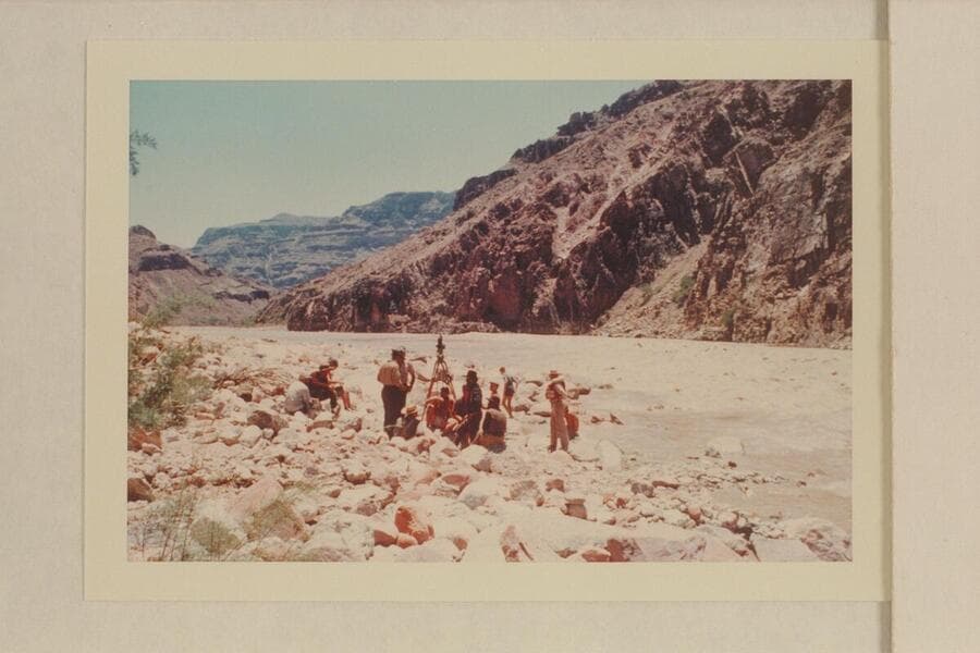 Picturing the Powell crew at 205 Mile Rapid. Jim Algar is extreme left in distance. Atht e camera are Russ Haverick; Dick Kelley; Gordon Avil; Doc Reed
