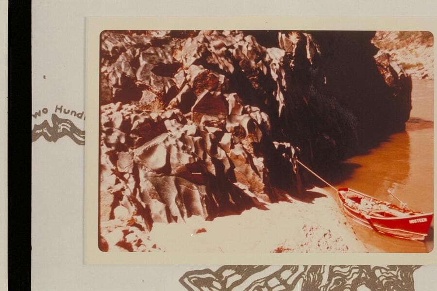 Mile 214 1/2 looking upstream. Float on air mattresses from Mile 209 to Separation Rapid. A lava remnant is on right bank