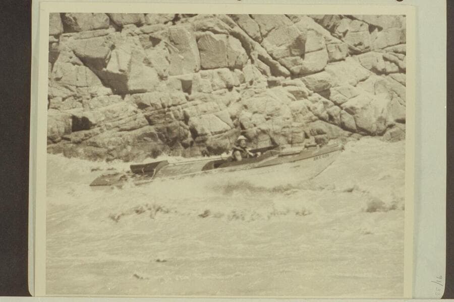 Dock Marston struggling to push the "Esmeralda II" up 217 Mile Rapid with its 75 HP inboard engine