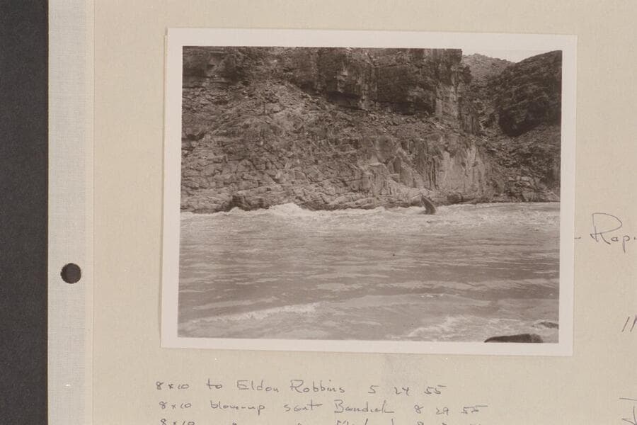 Rod Sanderson pilots the "Twin" through Mile 217 Rapid while Danny Daniels rides the bow. Stage approximates 50,000 cfs