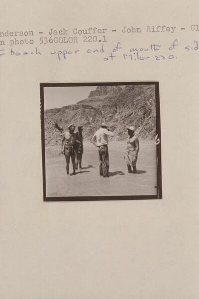 Rod Sanderson; Jack Couffer; John Riffey; Claude Nichols. On the beach upper end of mouth of side canyon at Mile 220