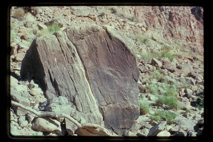 Boulder on right bank at Mile 211.6 at Rapid #3 which might carry the D. Julien inscription