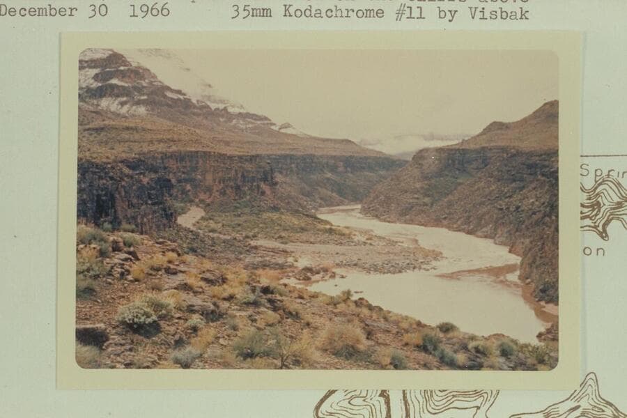 Down from Mile 216.7 showing snow on the cliffs. 217 Mile Canyon can be seen above point where the river disappears