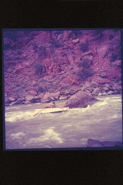 A. K. Reynolds passing the big rock at the lower end of Disaster Rapid. In high water, this rock is covered
