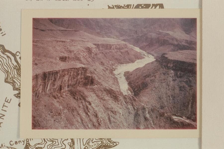 Up to Granite Springs Canyon from foot of Granite Springs Rapid. 220 Mile Canyon and Rapid in distance. Fault at upper left