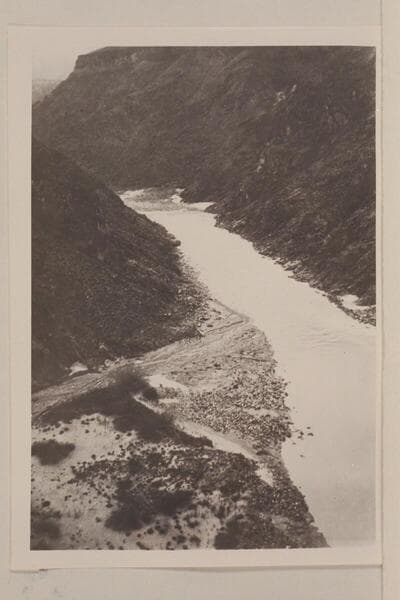 Down at head of Granite Spring Rapid, Mile 220.5. Three members of the party stand at the edge of the cliff over the rapid