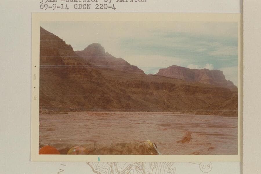 Up to Granite Springs Canyon from foot of Granite Springs Rapid. 220 Mile Canyon and Rapid in distance. Fault at upper left