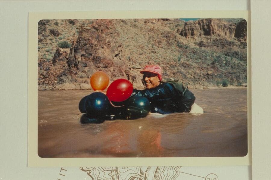 Homer Morgan swimming on air mattress through Bridge Canyon Rapid