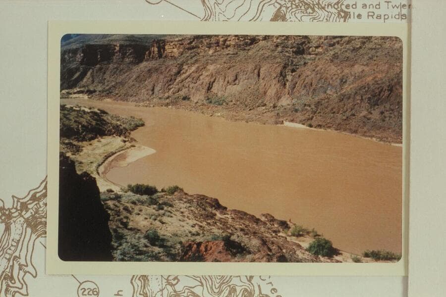In the river after embarking from 222 Mile Canyon with lava remnant in background
