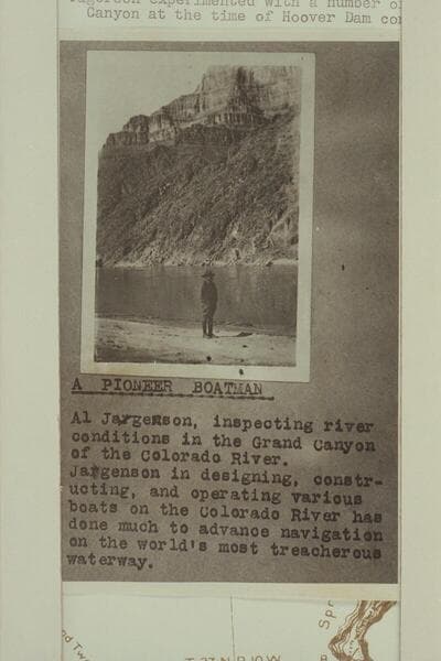 Albert S. Jagerson at the mouth of Diamond Creek. Jagerson experimented with a number of motorboats in Black Canyon at the time of Hoover Dam construction