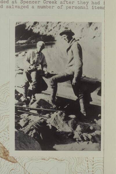 Reith Hyde is at right as he checks with Emery Kolb about the run from Diamond Creek down to Mile 237 where the sweep-scow had been sighted