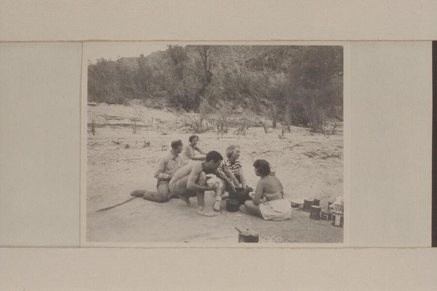 Puzzles at Diamond Creek camp of 1948 Nevills party. Wright in distance; Nevills; Doerr; Masland; Nancy Streator; Garth Marston; Rosalind Johnson
