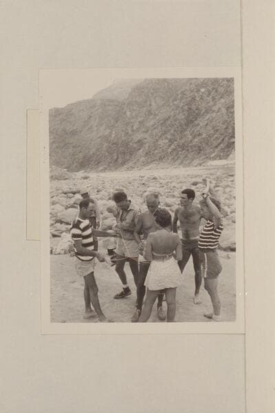 Puzzles at Diamond Creek camp of 1948 Nevills party. Wright in distance; Nevills; Doerr; Masland; Nancy Streator; Garth Marston; Rosalind Johnson