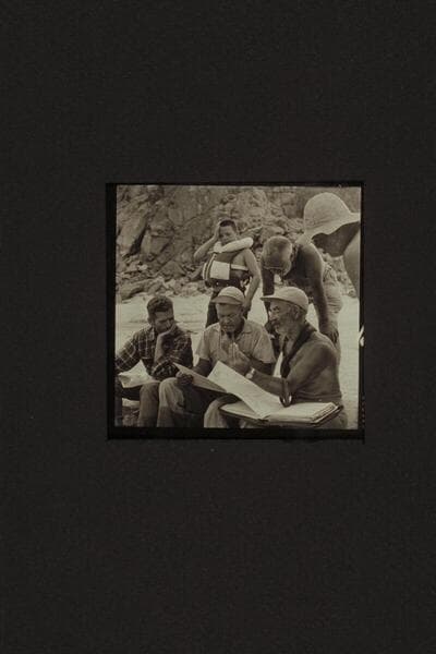 Briefing at Diamond Creek. Hugh Cutler sits lower left. Rod Sanderson and Marston work on the details from the charts. Buzzy Belknap indicates that all the talky-talk gives him a pain. Masland appears to find it interesting