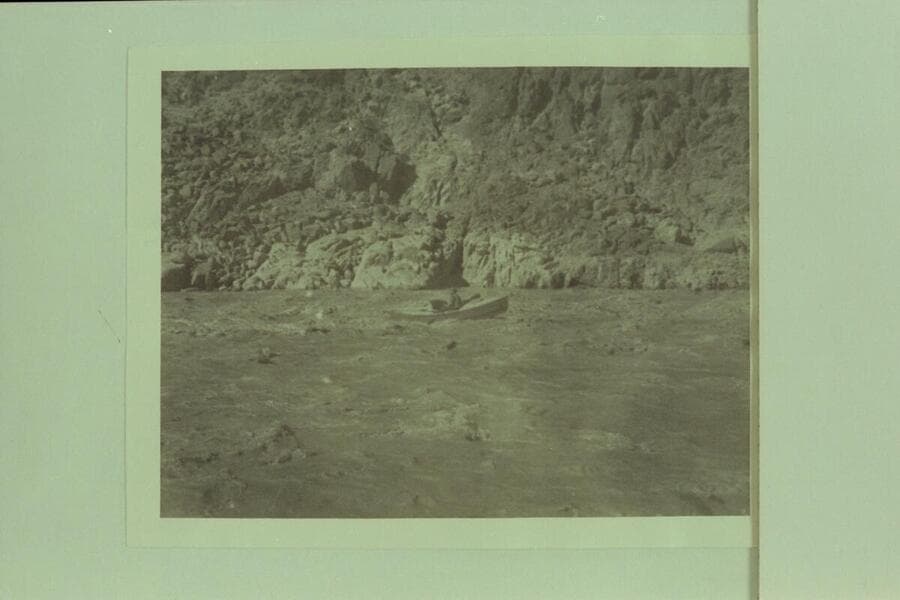Frank Dodge inspecting Holmstrom's boat as Buzz steps ashore; Diamond Creek