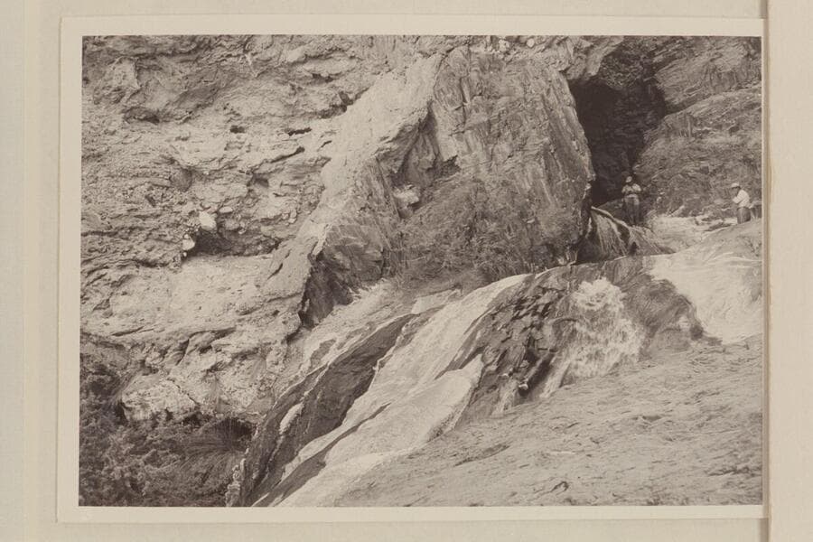 The travertine block at the mouth of Travertine Canyon. Ballard Atherton stands in the hole while Chuck Richey watches the stream from extreme right