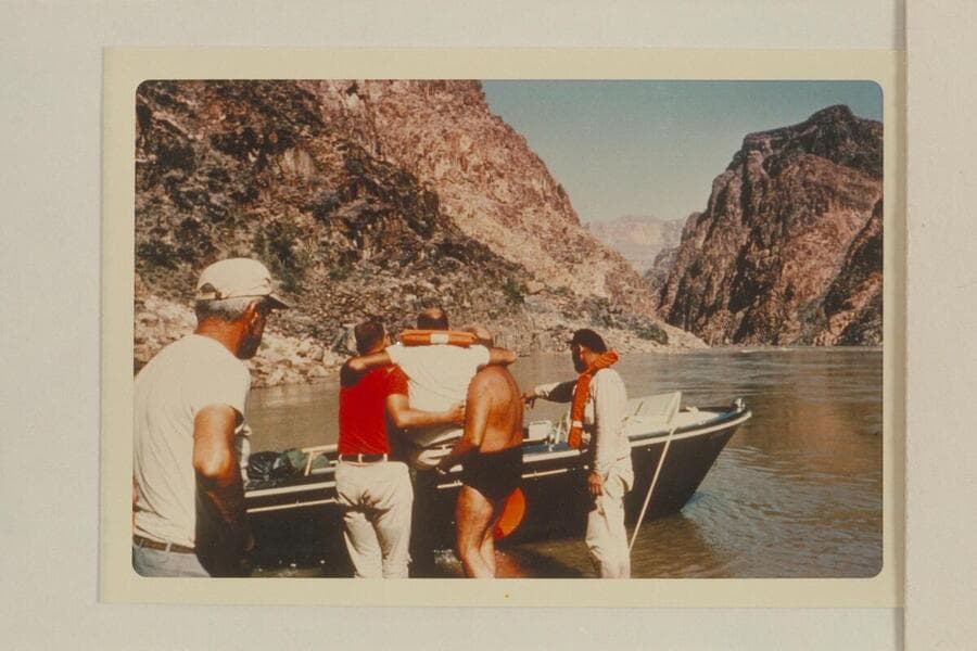 Jim Jordan directs the job of lifting the injured Komie into the Circle boat at the foot of 231 Mile Rapid